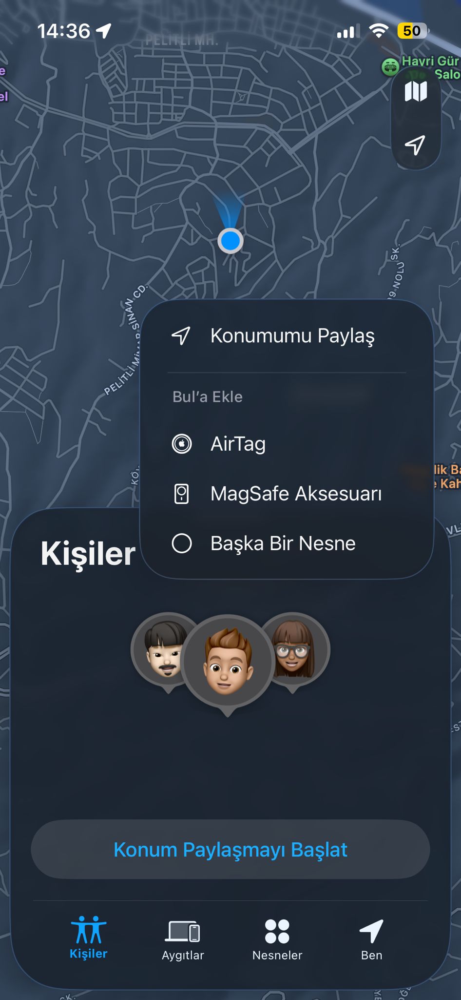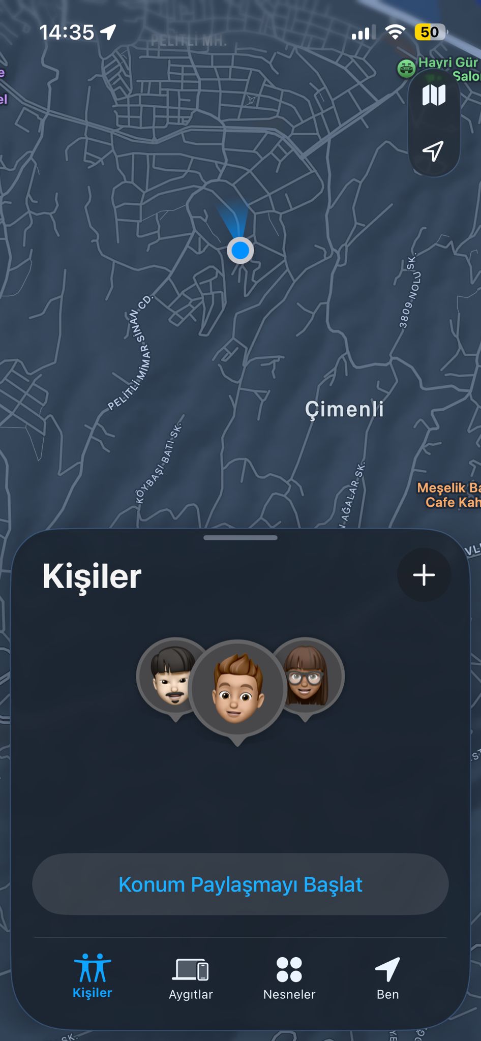 Burada, konumunu paylaştığın kişilerin bir listesi yer alır. Konumunu görmek istediğin kişinin adına dokunduğunda, o kişinin anlık konumunu harita üzerinde görüntüleyebilirsin. Eğer kişiyi listede göremiyorsan, karşılıklı olarak konum paylaşımının açık olduğundan emin olman gerekir.